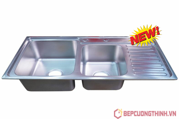 Với kích thước chậu 100x47(cm) kích thước khoét đá 980x450(mm) đây là kích thước lý tưởng của căn bếp rộng,Chậu được thiết kế 2 hố lệch tiện dụng,qúa trình sử dụng khi xả nước hố nhỏ nhnah đầy, hố to rộng rãi thoải mái, tiết kiệm thời gian và tiết kiệm cả chi phí cho chị em nội trợ không những thế chậu có bàn chờ bên phải rất tiện dụng trong quá trình rửa chế biến thực phẩm. Bạn có thể đặt trực tiếp thực phẩm lên mặt bàn chờ.